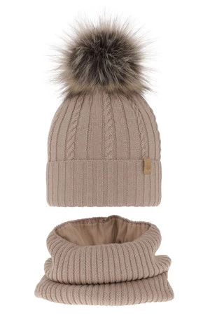 Czapka i komin dla dziewczynki zimowy komplet, beżowy, wełniany merino Mirabel