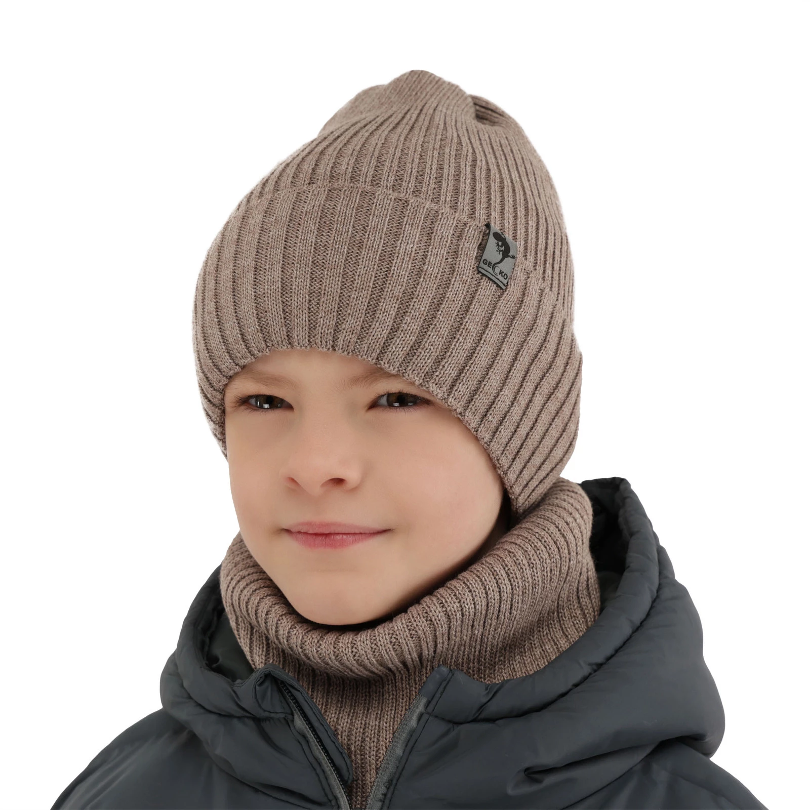 Czapka i komin dla chłopca zimowy komplet, szary, z wełną merino, podszyty polarem Gecko