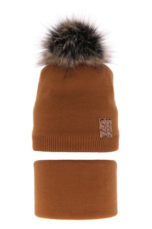 Czapka i komin dla dziewczynki zimowy komplet, camelowy, z pomponem Apolinka