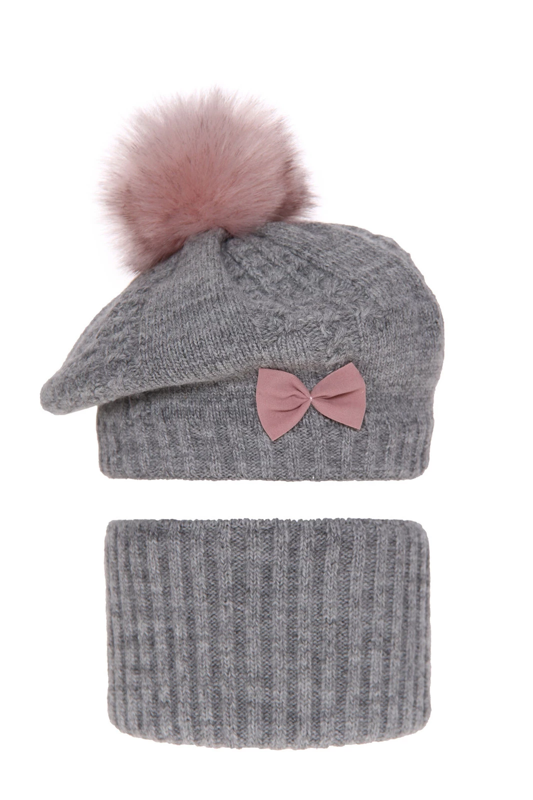 Beret i komin dla dziewczynki zimowy komplet, szary, z pomponem Amora