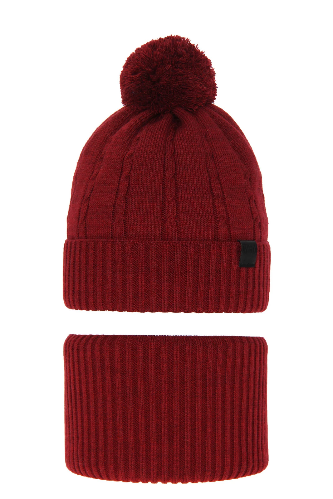 Czapka i komin dla chłopca zimowy komplet, bordowy, z pomponem Deny