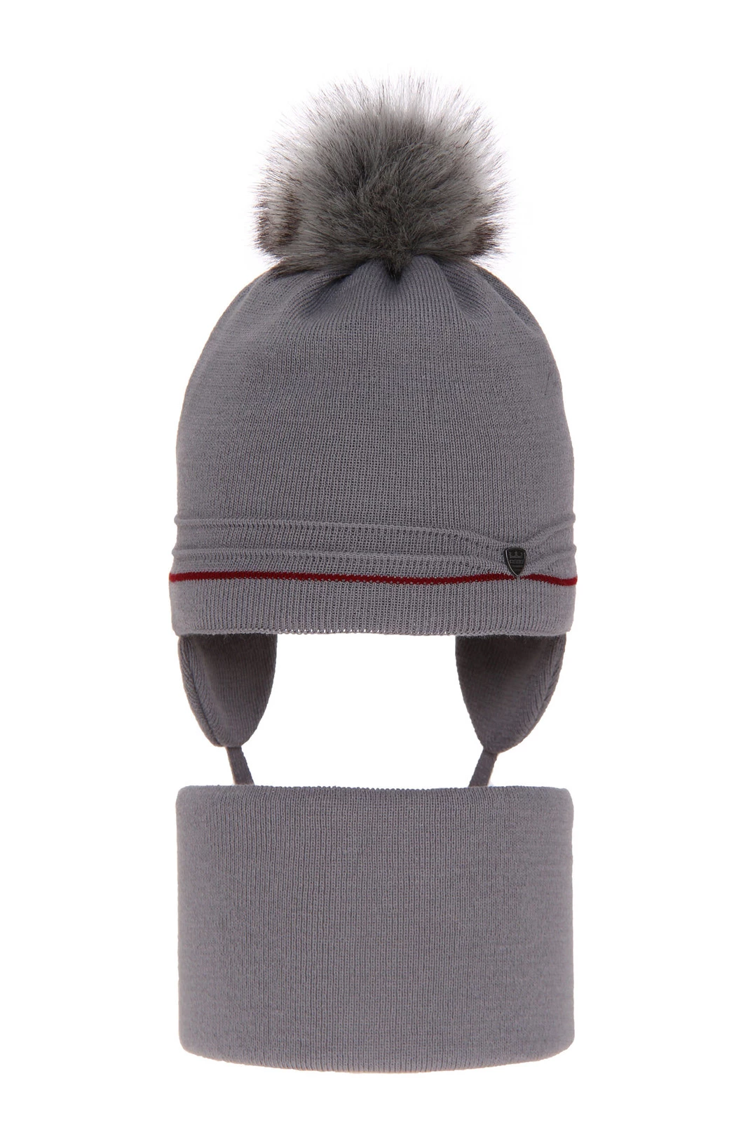 Czapka i komin dla chłopca zimowy komplet, szary, z pomponem, wiązany Burgund