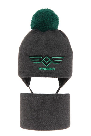 Czapka i komin dla chłopca zimowy komplet, szary, z pomponem, wiązany Wings