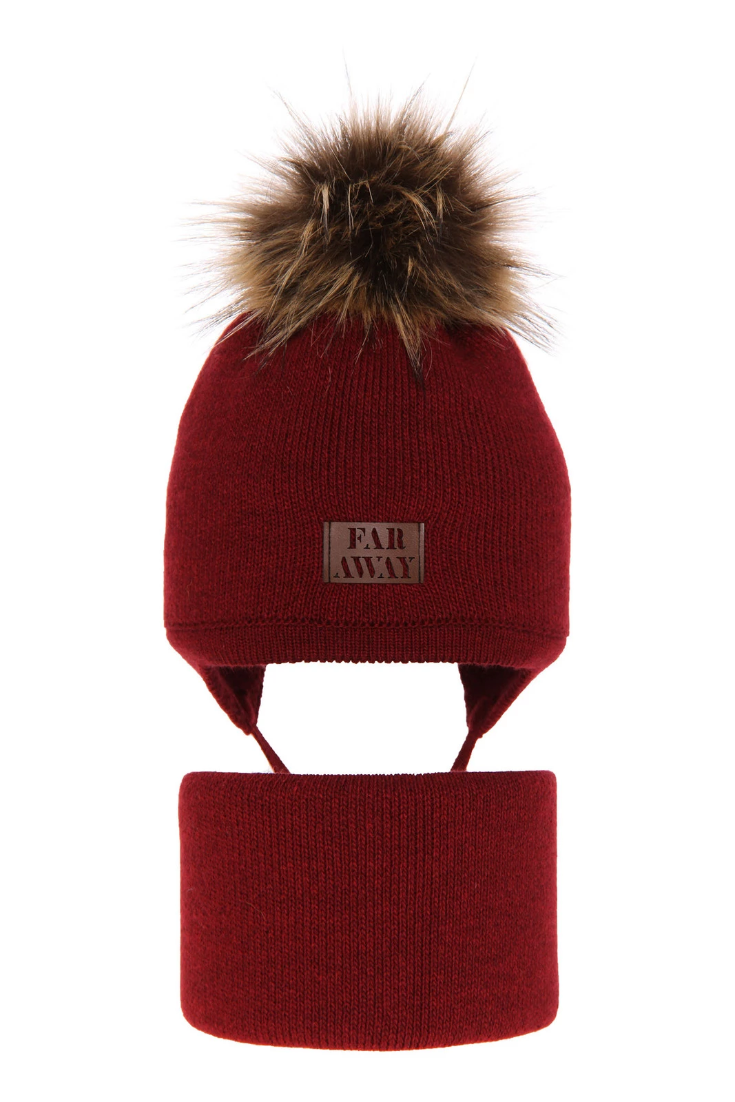 Czapka i komin dla chłopca zimowy komplet, bordowy, z pomponem Druid