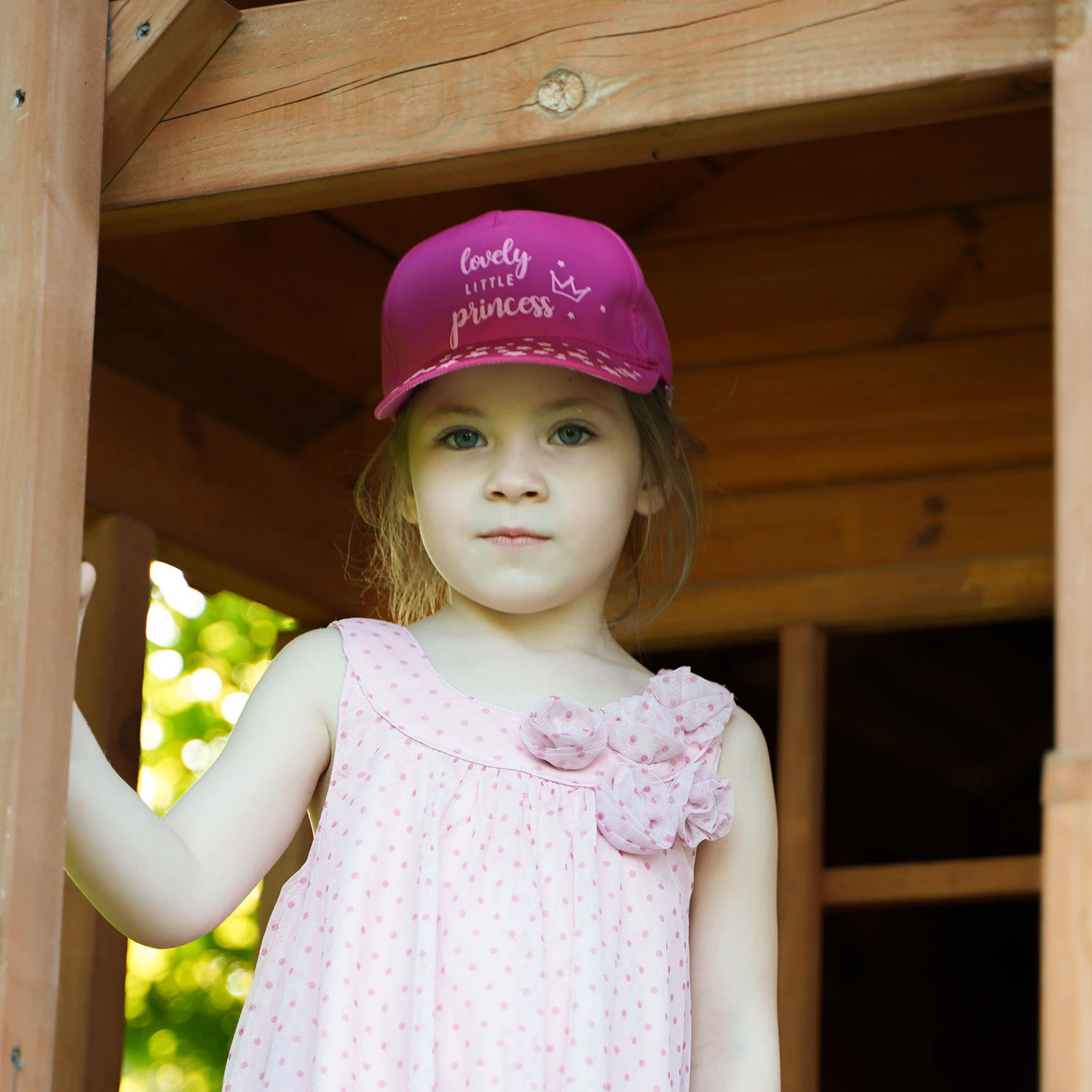 Czapka dziewczęca wyróżnia się urokliwą aplikacją na daszku z motywem gwiazdek oraz uroczym napisem "lovely little princess", który dodaje jej dziewczęcego charakteru. Jest to nie tylko praktyczny element garderoby, ale również modny dodatek, który Twoja mała księżniczka będzie z dumą nosić podczas letnich spacerów, wycieczek czy zabaw w parku.