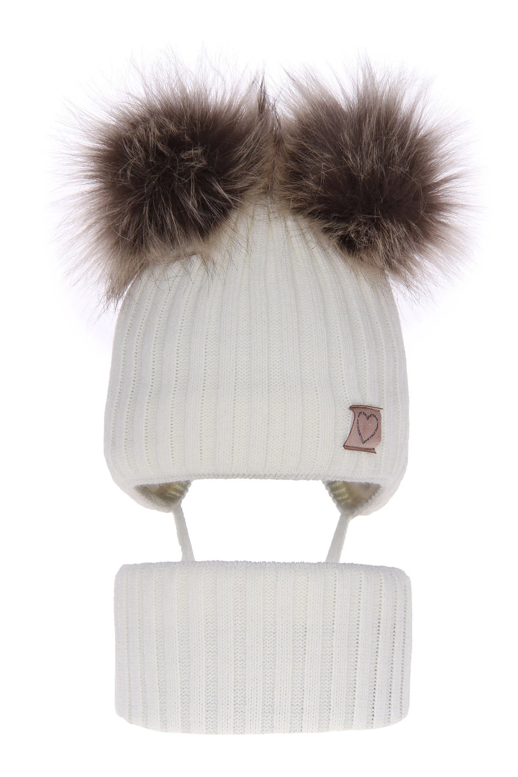 Czapka i komin dla dziewczynki zimowy komplet, biały, z dwoma pomponami, wiązany Telisa