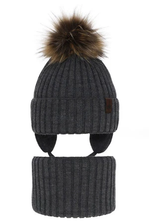 Czapka i komin dla chłopca zimowy komplet, ciemnoszary, z pomponem Puzel