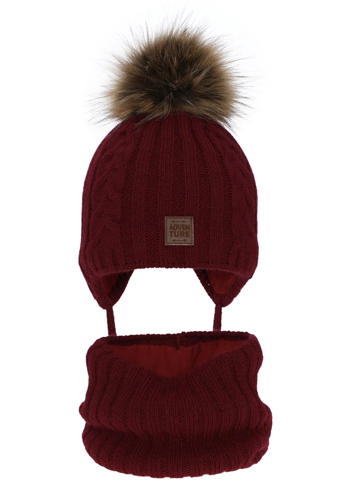 Czapka i komin dla chłopca zimowy komplet, bordowy, z pomponem, wiązany Casper