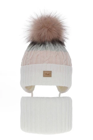 Czapka i komin dla dziewczynki zimowy komplet, kremowy, z pomponem, wiązana Riviera