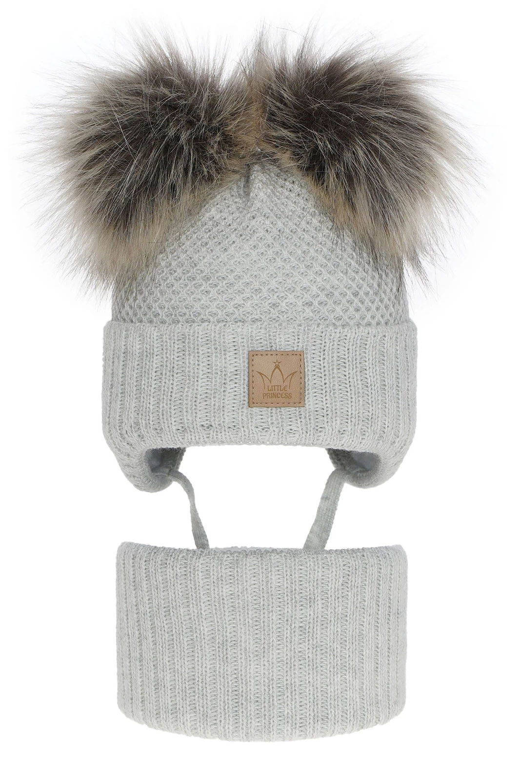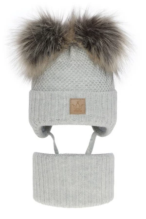 Czapka i komin dla dziewczynki zimowy komplet, szary, z dwoma pomponami Minsi