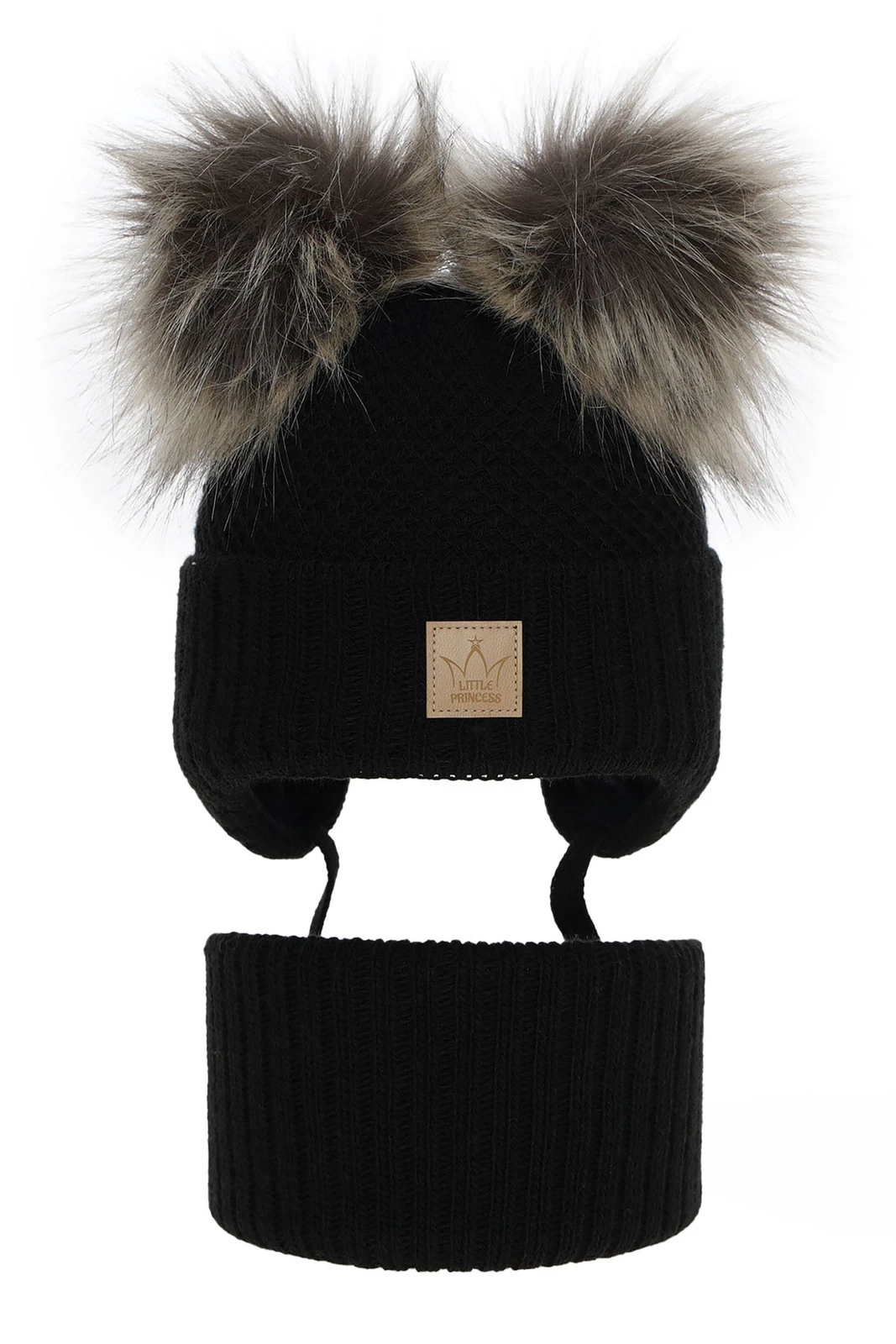 Czapka i komin dla dziewczynki zimowy komplet, czarny, z dwoma pomponami Minsi