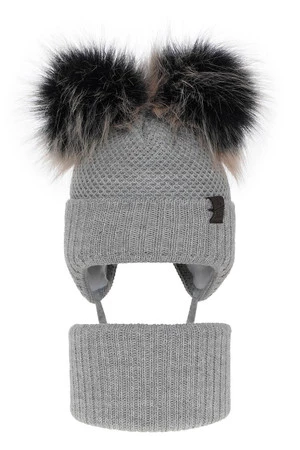 Czapka i komin dla chłopca zimowy komplet, szary, z dwoma pomponami, wiązany Randel