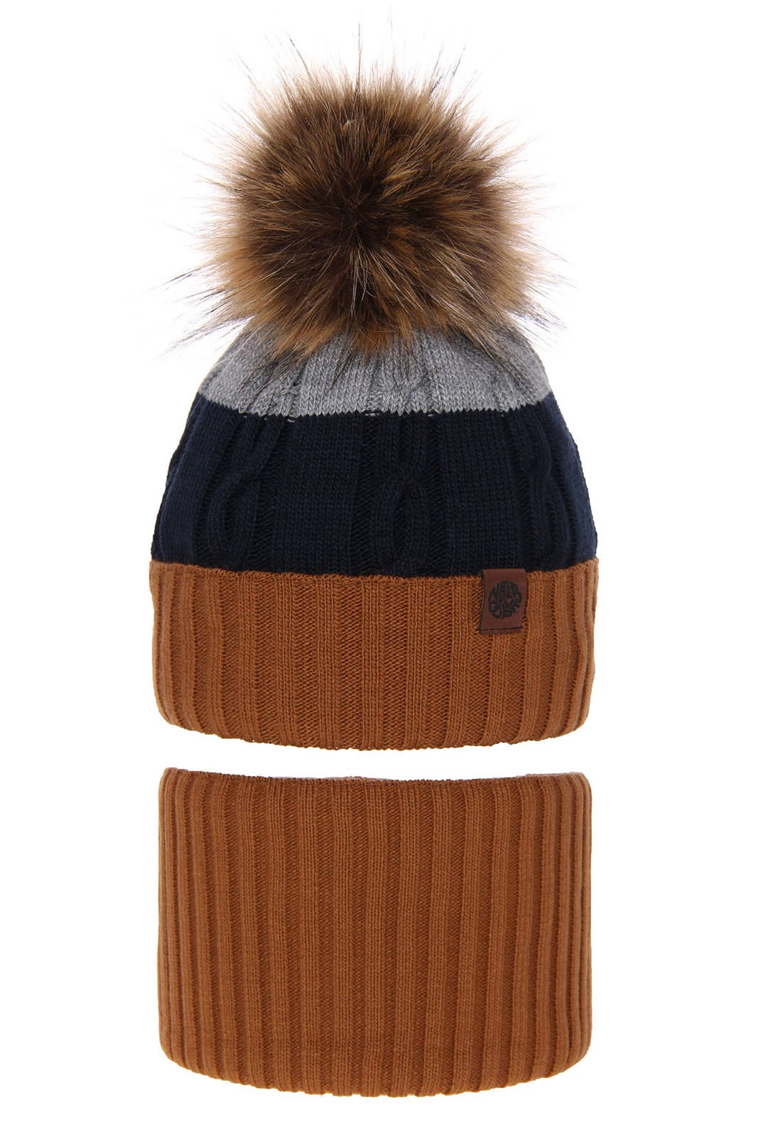 Czapka i komin dla chłopca zimowy komplet, brązowy, z pomponem Karmel
