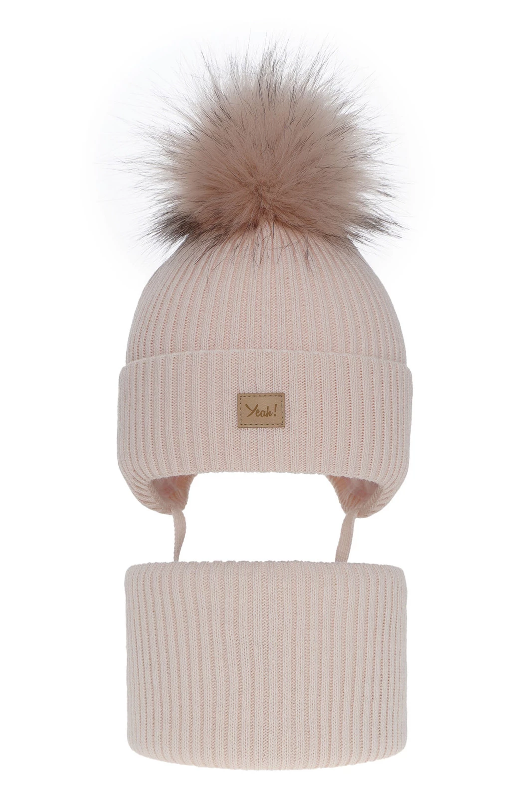 Czapka i komin dla dziewczynki zimowy komplet, różowy, z pomponem Dilajla