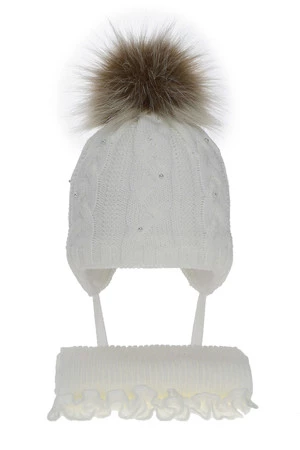 Czapka i szalik dla dziewczynki zimowy komplet, biały, z pomponem Mirella