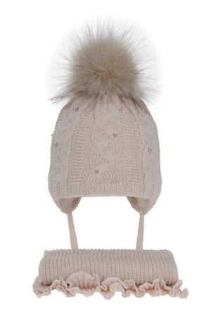 Efektownym wykończeniem kompletu jest duży, miękki pompon z eco-futerka, który nadaje całości uroczego charakteru. Szalik został starannie wykończony, zachowując spójność stylistyczną z czapką. Materiał, z którego wykonany jest komplet zimowy, charakteryzuje się przyjemną w dotyku strukturą, która nie podrażnia delikatnej skóry dziecka.