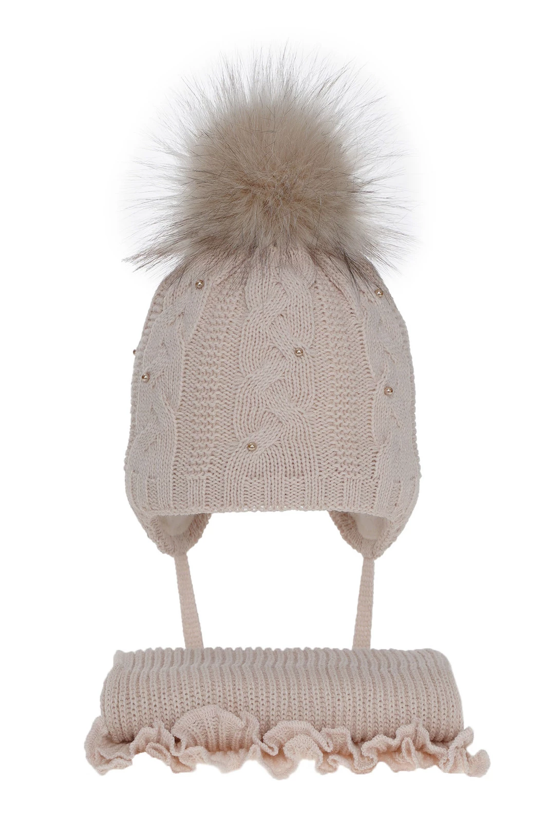 Komplet zimowy dla dziewczynki wyróżnia się starannie wykonanym warkoczowym splotem na czapce, który dodaje uroku i podkreśla dziewczęcy charakter. Eleganckie perełki stanowią subtelną ozdobę, idealnie komponującą się z całością. Delikatne troki nie tylko pełnią funkcję praktyczną, zapewniając stabilne utrzymanie czapki na głowie nawet podczas intensywnych zabaw, ale także dodają uroku całej stylizacji.