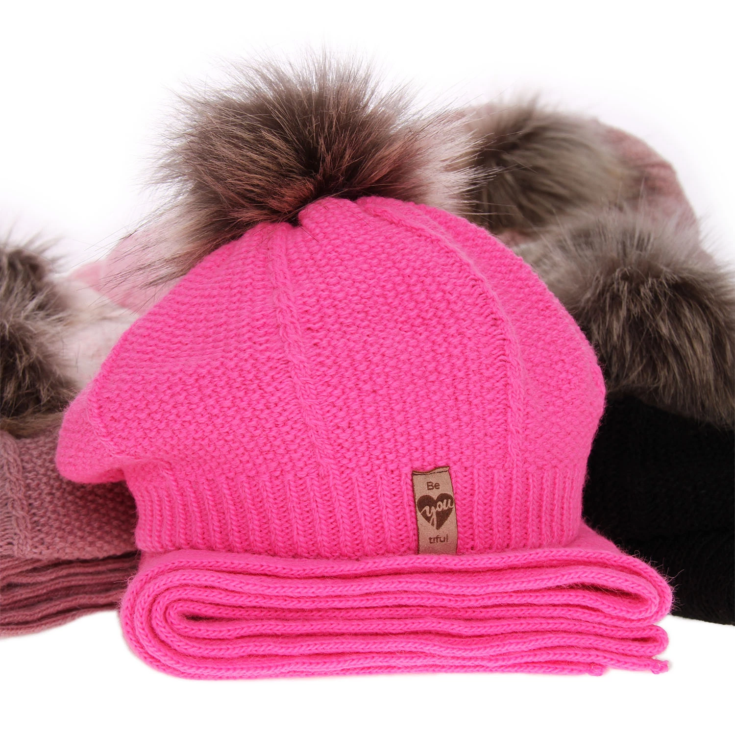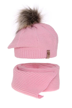 Beret i szalik dla dziewczynki zimowy komplet, różowy, z pomponem Elif