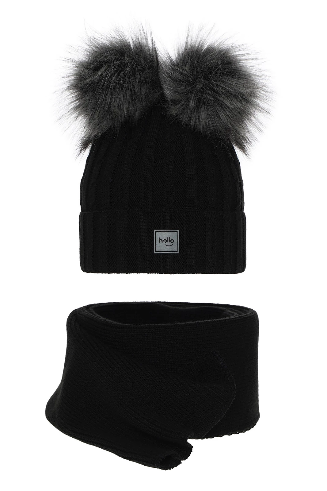 Czapka i szalik dla dziewczynki zimowy komplet, czarny, z dwoma pomponami Zenda