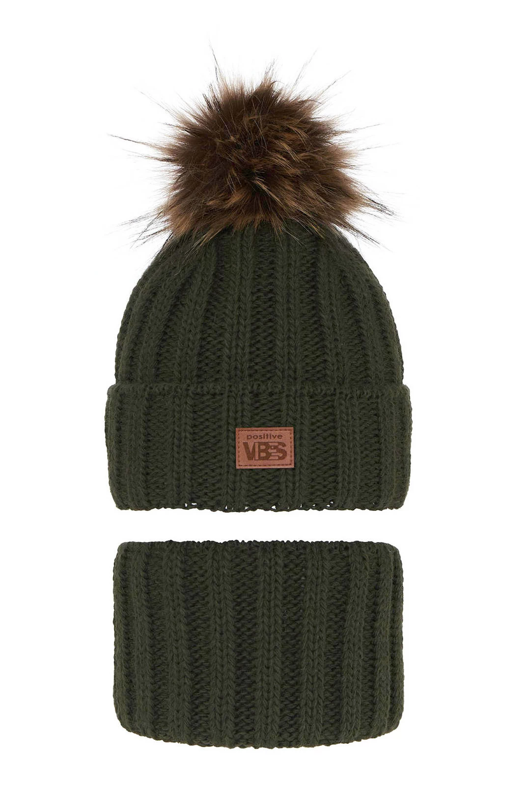 Czapka i komin dla chłopca zimowy komplet, khaki, z pomponem Remes