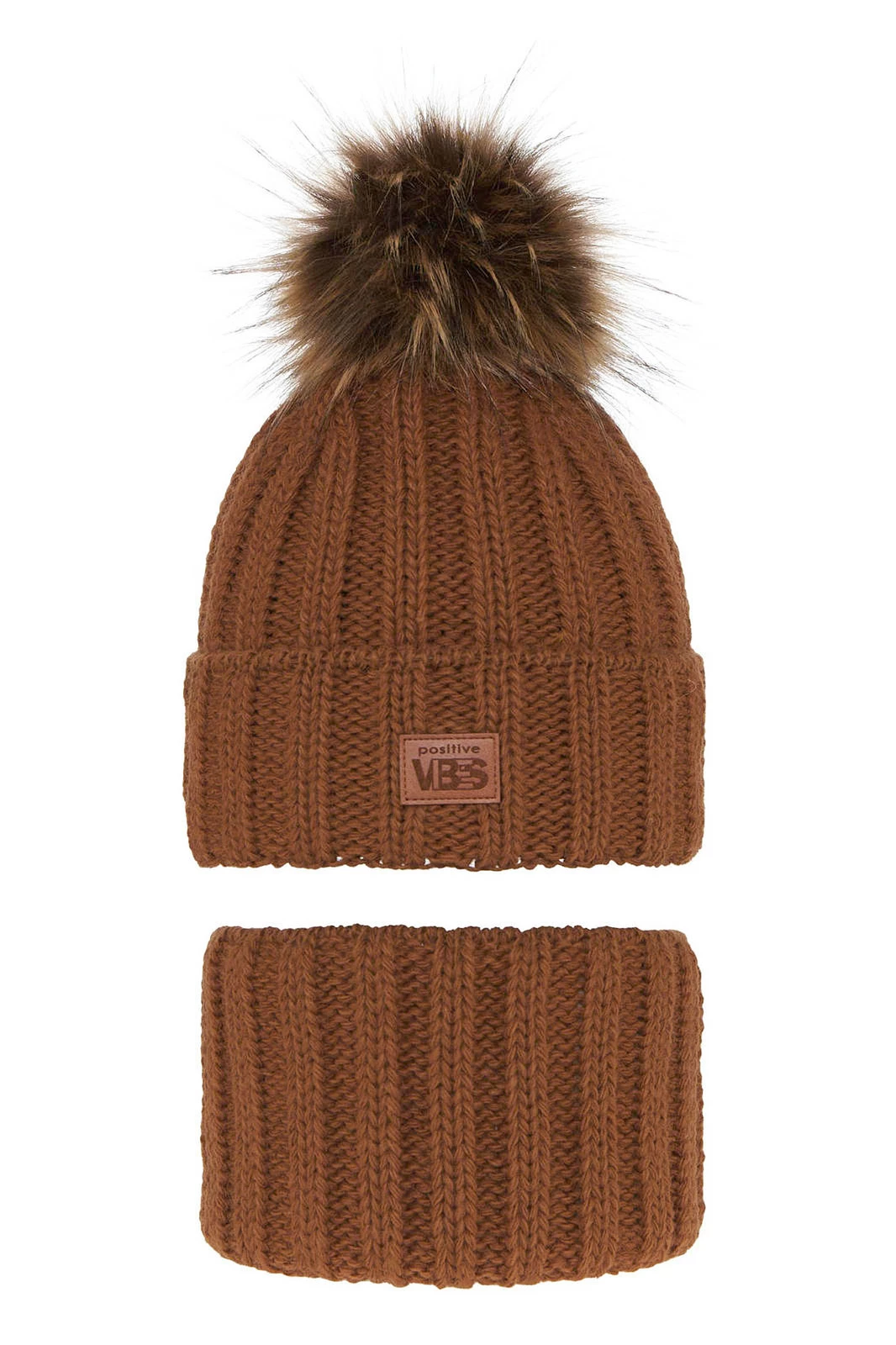 Czapka i komin dla chłopca zimowy komplet, brązowy, z pomponem Remes