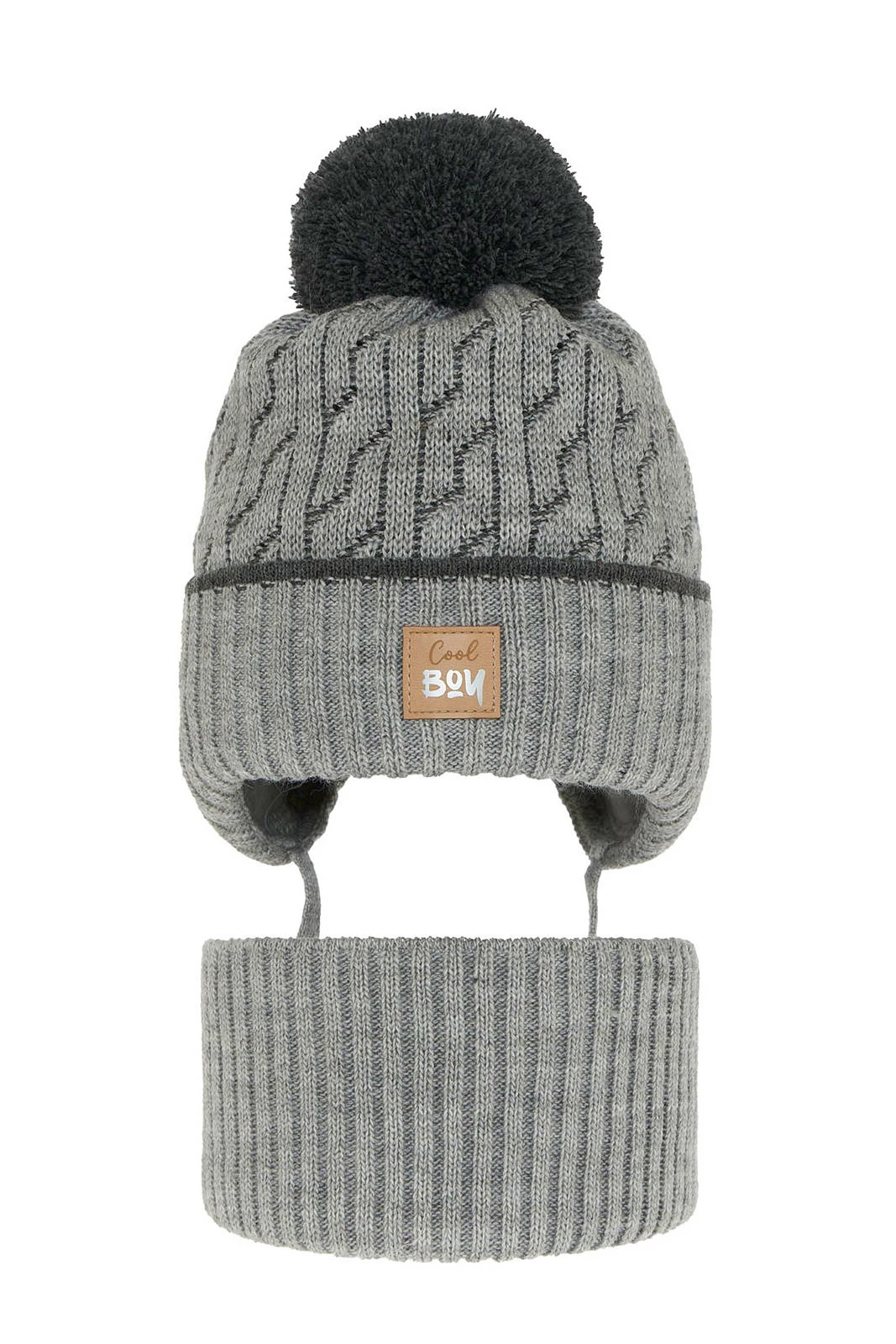 Czapka i komin dla chłopca zimowy komplet, szary, z pomponem, wiązany Pikolo