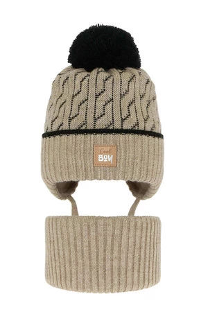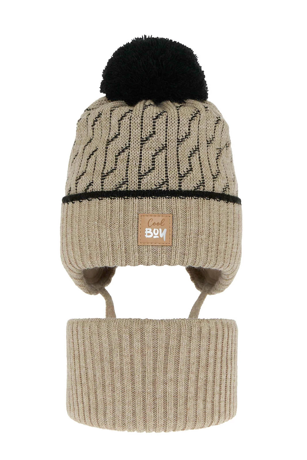 Czapka i komin dla chłopca zimowy komplet, beżowy, z pomponem Pikolo