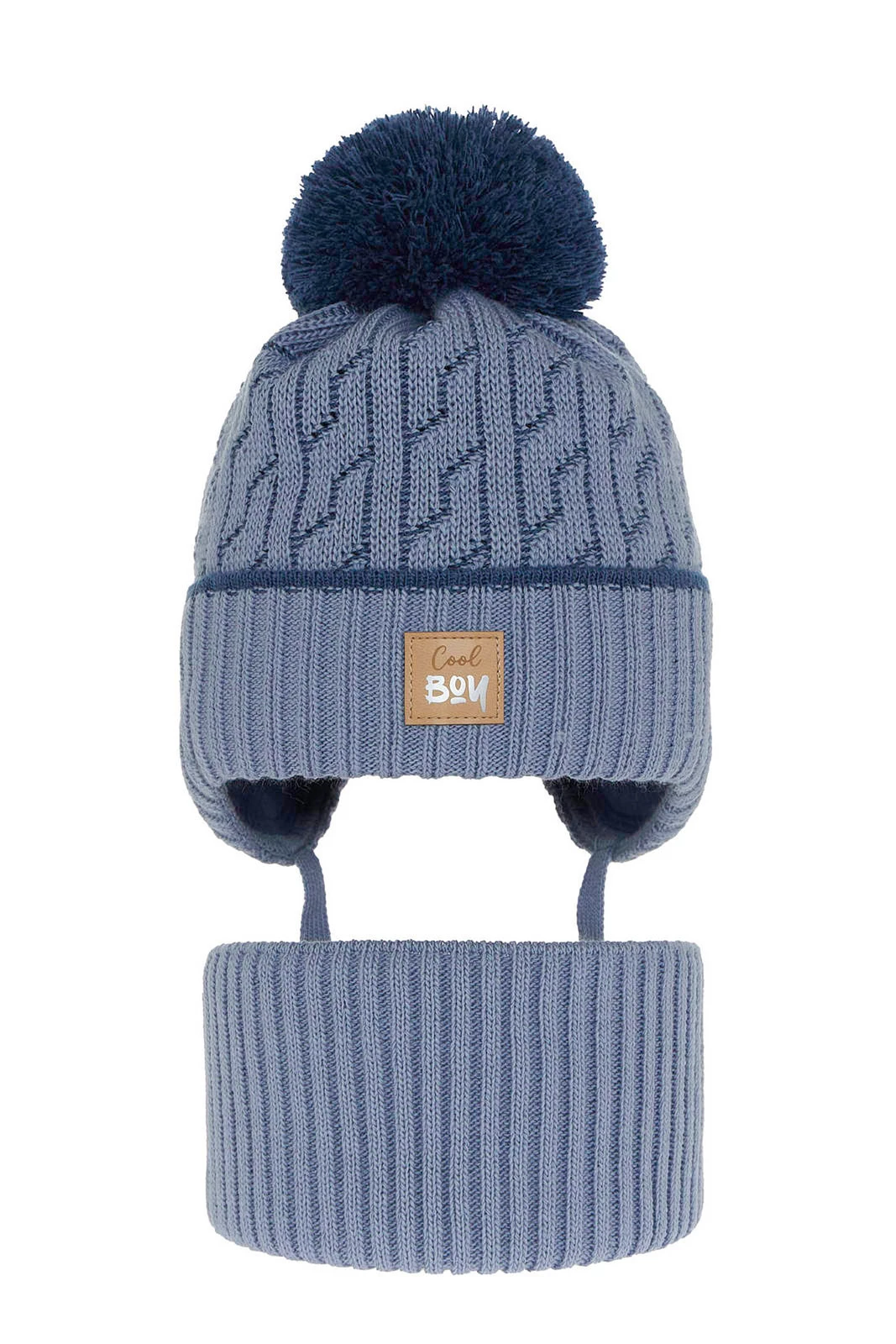 Czapka i komin dla chłopca zimowy komplet, niebieski, z pomponem Pikolo