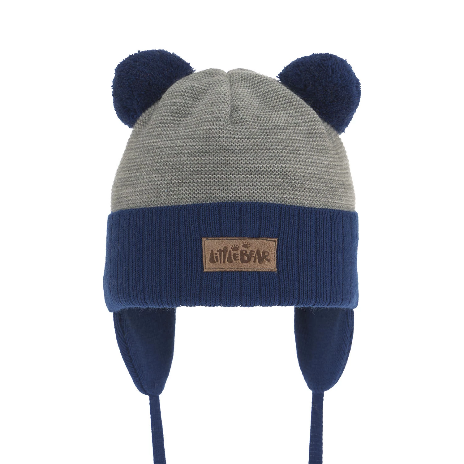 Czapka jesienna, wiosenna dla chłopca, granatowa, z dwoma pomponami, wiązana Gigant