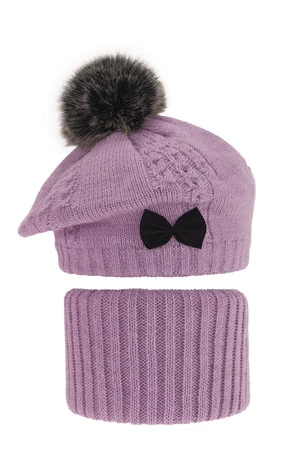 Beret i komin dla dziewczynki zimowy komplet, fioletowy, z pomponem Amora