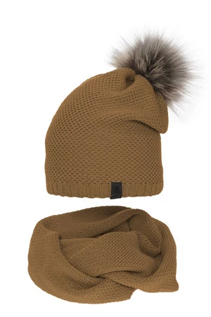 Czapka i komin damski zimowy komplet, camel, z pomponem Kaliana