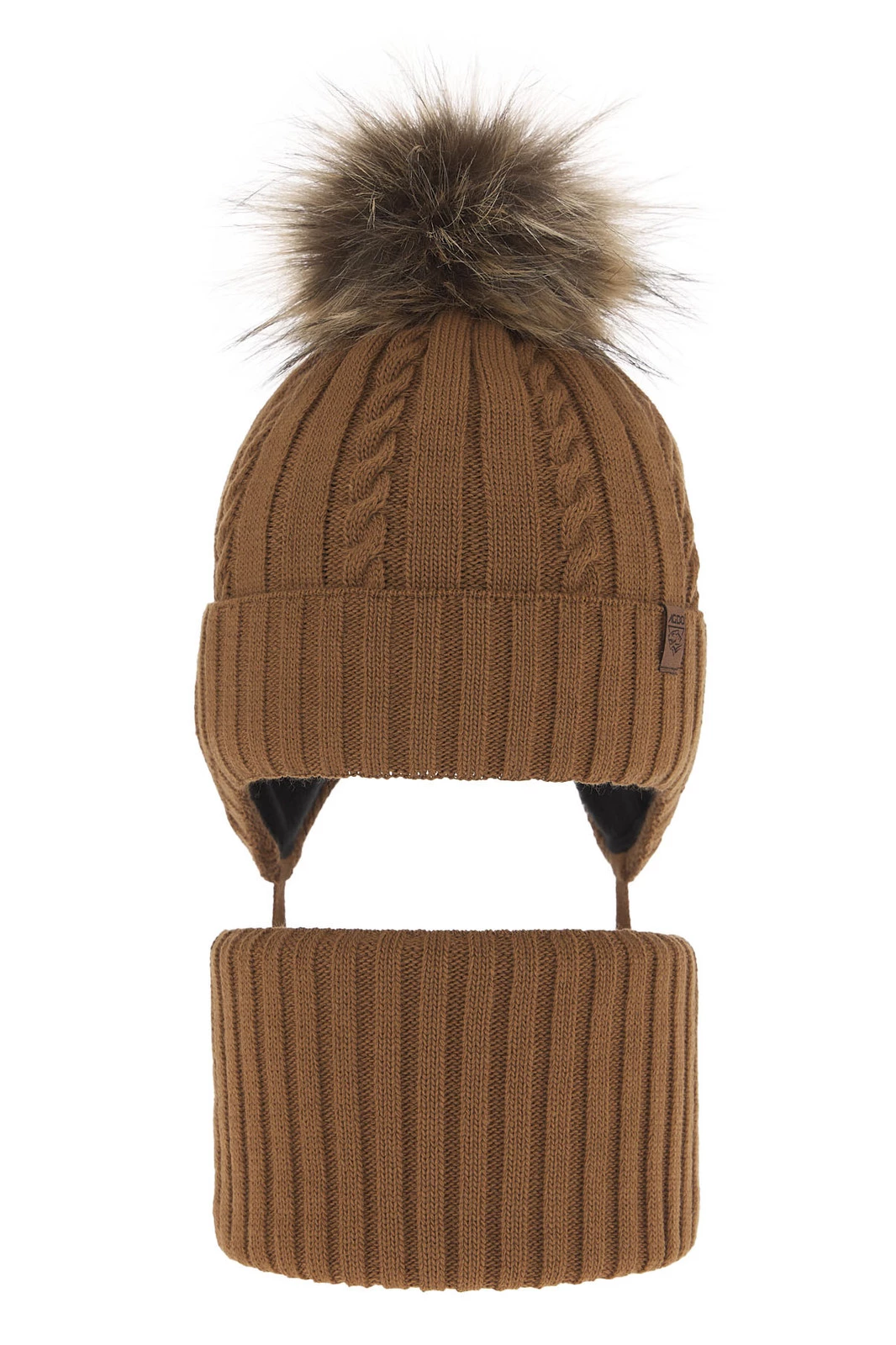 Czapka i komin dla chłopca zimowy komplet, camelowy, z pomponem, wiązany Peter
