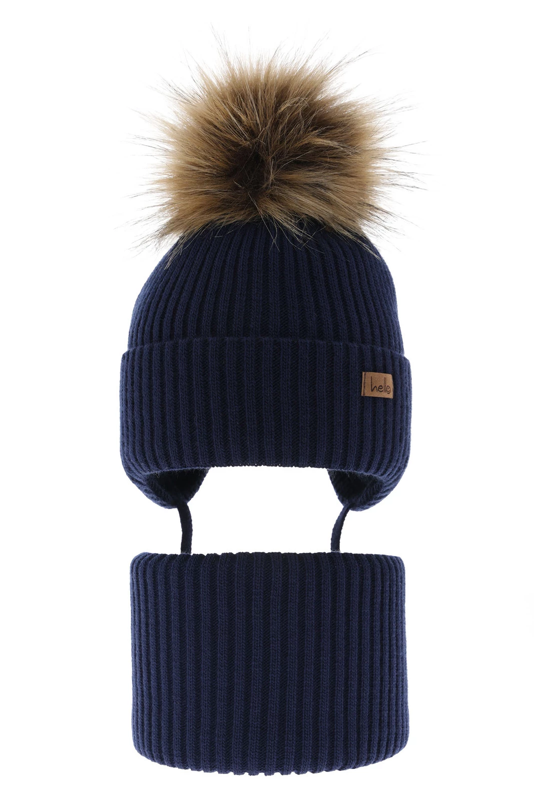 Czapka i komin dla chłopca zimowy komplet, granatowy, z pomponem Bergo