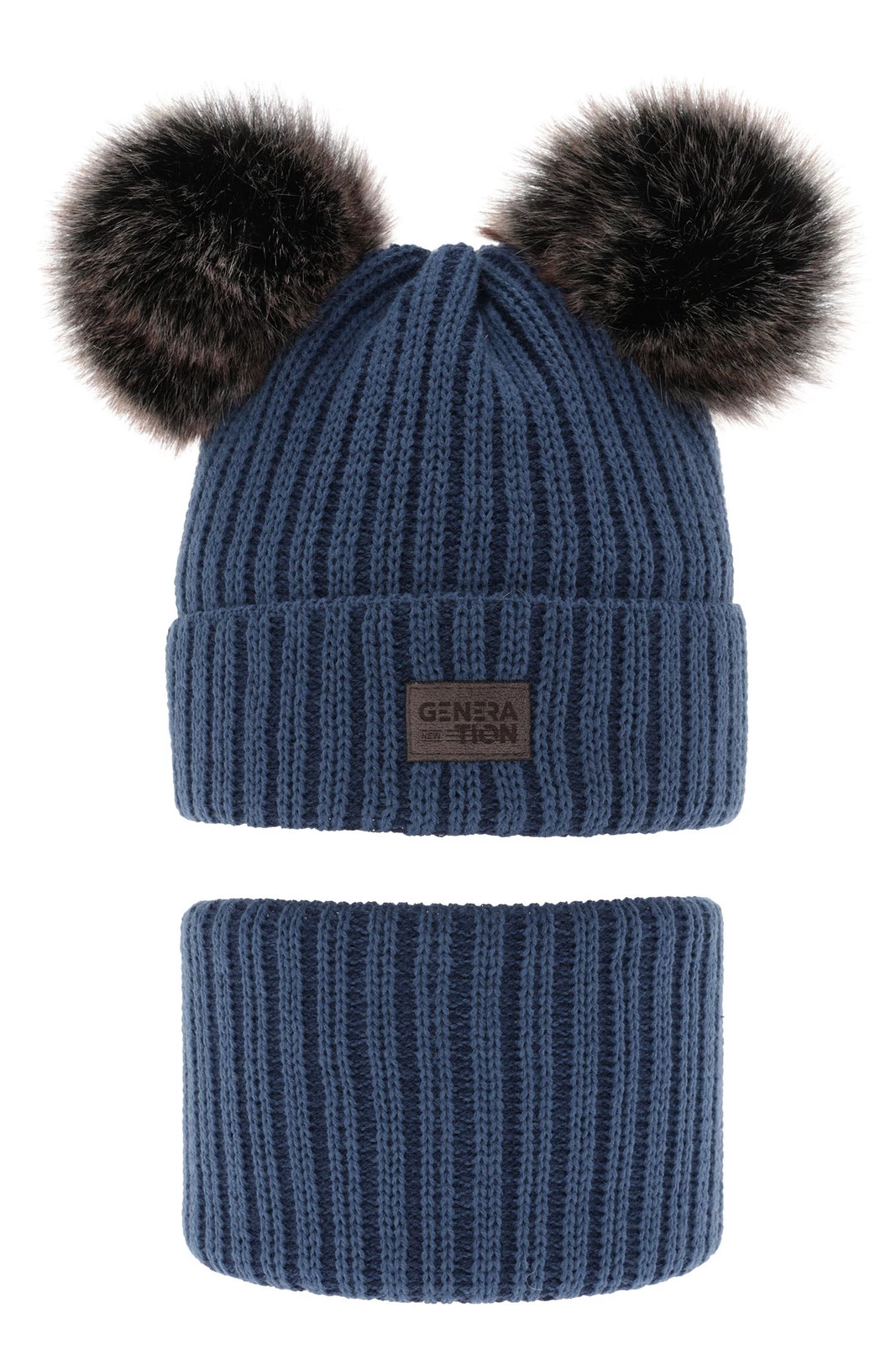 Czapka i komin dla chłopca zimowy komplet, niebieski, z dwoma pomponami Tokio