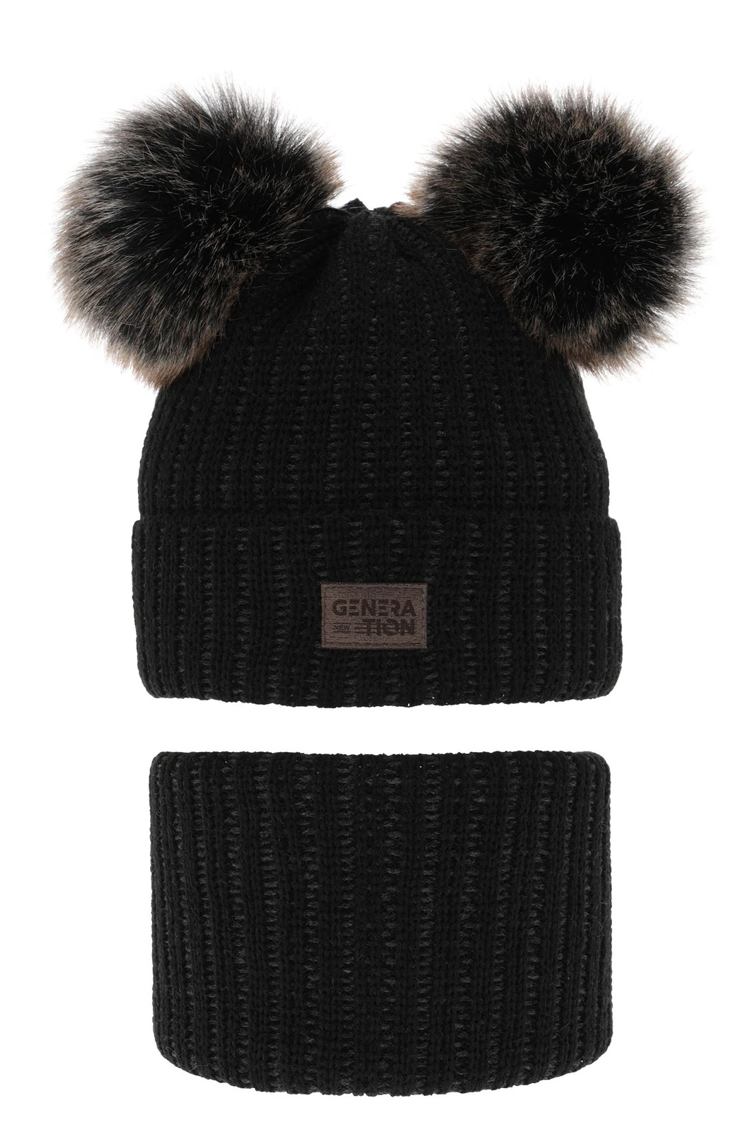Czapka i komin dla chłopca zimowy komplet, czarny, z dwoma pomponami Tokio