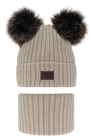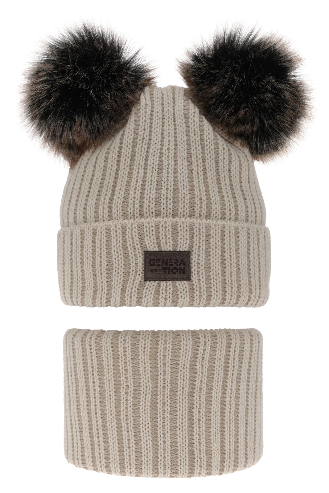 Czapka i komin dla chłopca zimowy komplet, beżowy, z dwoma pomponami Tokio