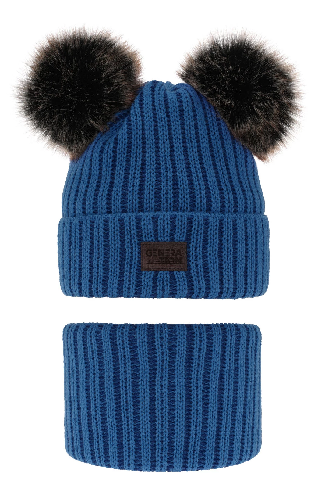 Czapka i komin dla chłopca zimowy komplet, niebieski, z dwoma pomponami Tokio