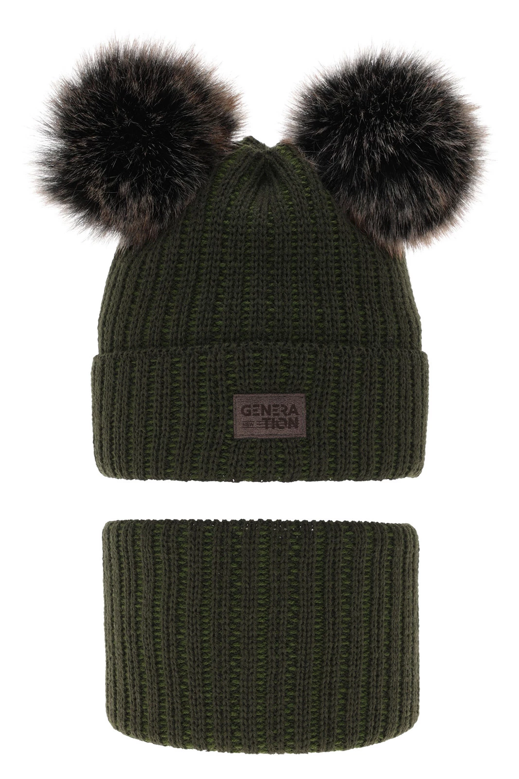Czapka i komin dla chłopca zimowy komplet, khaki, z dwoma pomponami Tokio