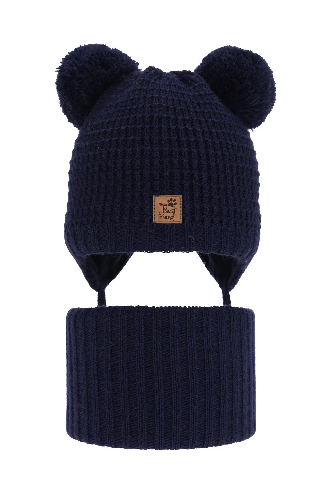 Czapka i komin dla chłopca zimowy komplet, granatowy, wiązany, z dwoma pomponami Krispi