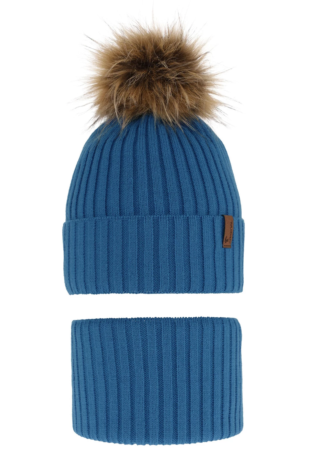 Czapka i komin dla chłopca zimowy komplet, niebieski, z pomponem Onyks