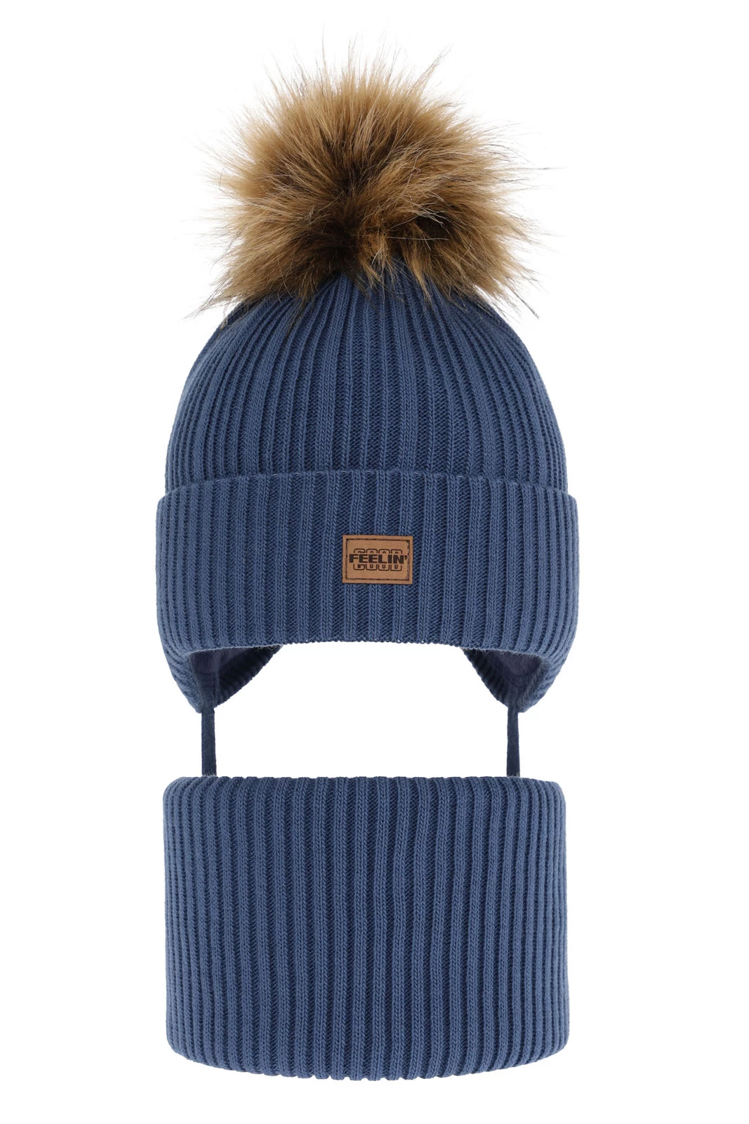 Czapka i komin dla chłopca zimowy komplet, niebieski, z pomponem Eger