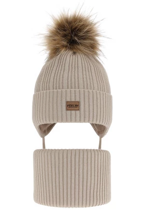Czapka i komin dla chłopca zimowy komplet, beżowy, z pomponem Eger