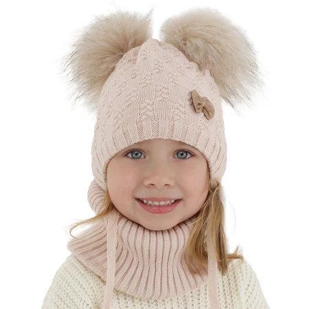 Czapka i komin dla dziewczynki zimowy komplet, różowy, z dwoma pomponami, wiązany Bettina