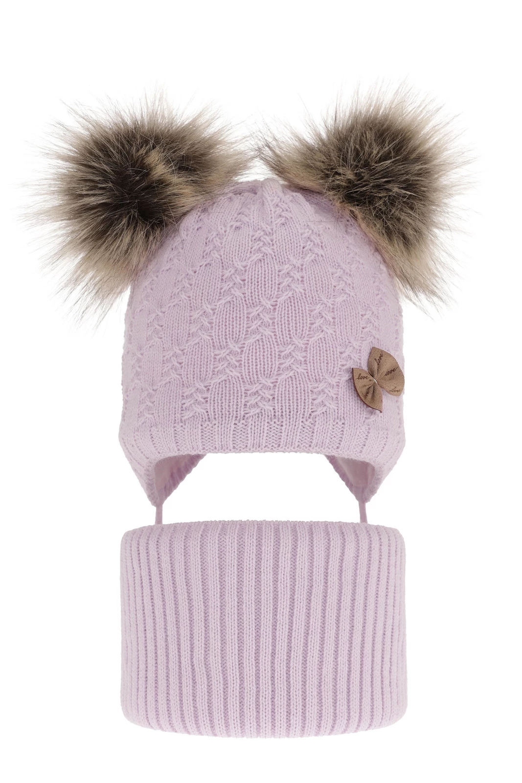 Czapka i komin dla dziewczynki zimowy komplet, liliowy, z dwoma pomponami, wiązany Bettina