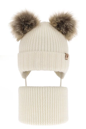 Czapka i komin dla dziewczynki zimowy komplet, kremowy, 100% wełniana merino, wiązany, z dwoma pomponami Silvia