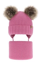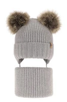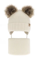 Czapka i komin dla dziewczynki zimowy komplet, beżowy, 100% wełniana merino, wiązany, z dwoma pomponami Silvia