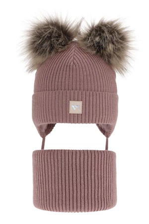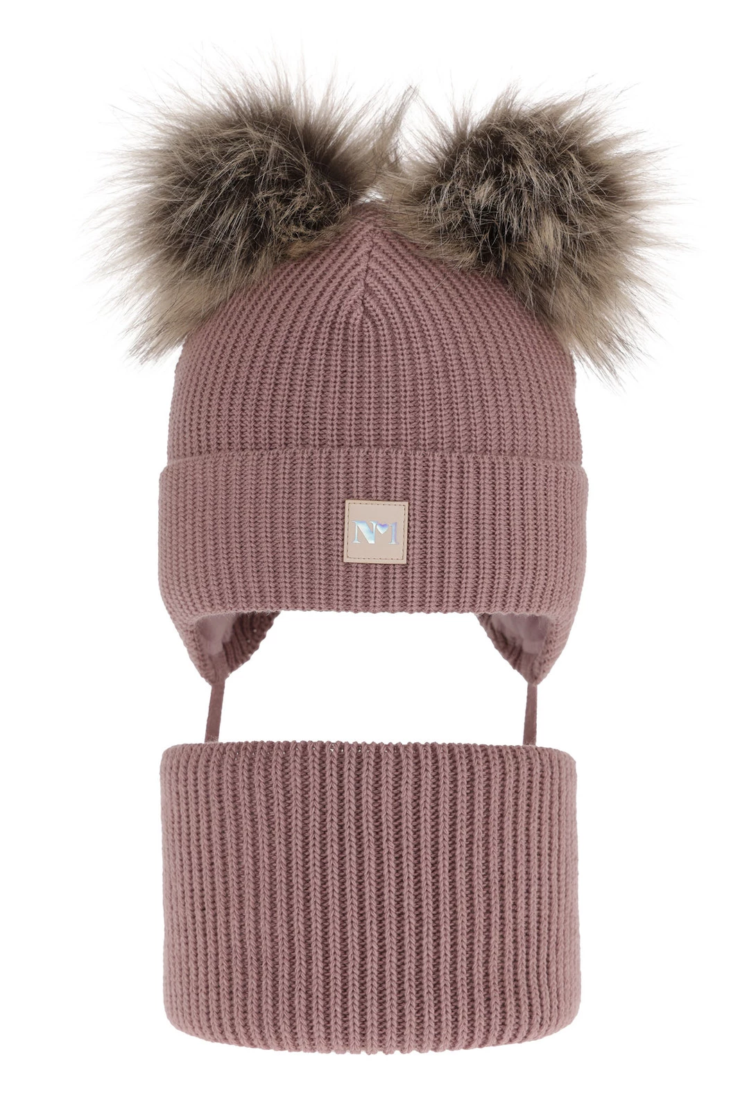 Czapka i komin dla dziewczynki zimowy komplet, wrzosowy, z dwoma pomponami, wiązany Kiara