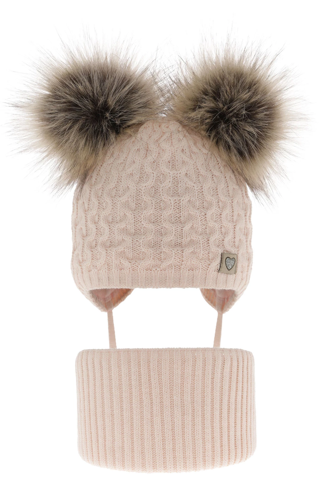 Czapka i komin dla dziewczynki zimowy komplet, jasnoróżowy, z dwoma pomponami Poliana