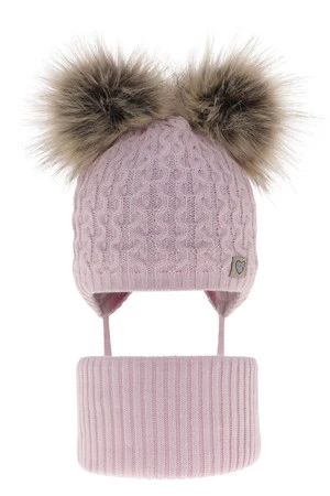 Czapka i komin dla dziewczynki zimowy komplet, liliowy, z dwoma pomponami, wiązany Poliana