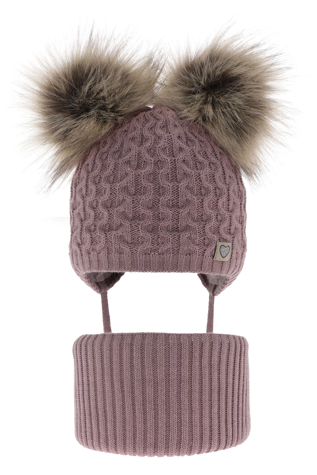 Czapka i komin dla dziewczynki zimowy komplet, wrzosowy, z dwoma pomponami, wiązany Poliana